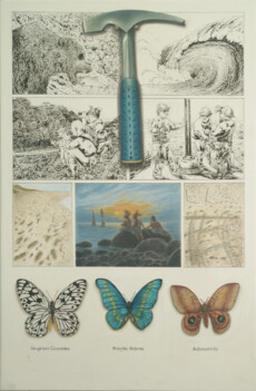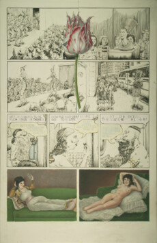 Pages of a book, paintings on a wall—a familiar presentation, twisted and blended, the edges between the two blurred, so that the familiar becomes strange and surprising.