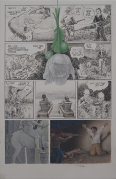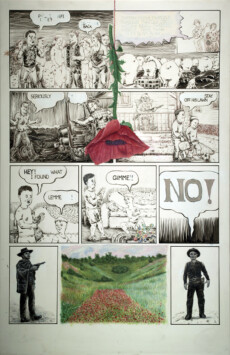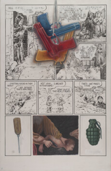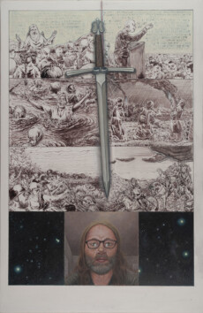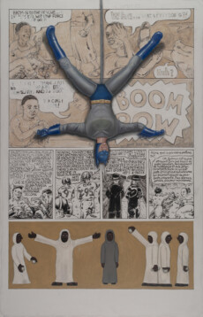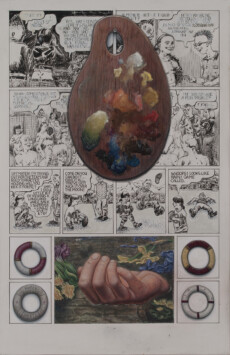 The paintings themselves are begun in the traditional method of glue/chalk gesso on wood panel, and the framework for the 2-D work to come is the comics panel; within that framework, as elements from painting, illustration, comics, comix, cartoons, illuminated manuscripts, and other artifacts are added and juxtaposed, so are the various mediums associated with those art forms.