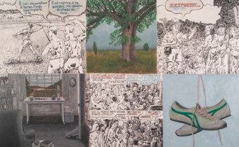 Each panel is 12″ x 32″, except for Sunday which is 16″ x 32″, and is on a baltic birch panel with a traditional glue/chalk gesso ground. Mediums used are: graphite, india ink, acrylic, shellac inks, egg tempera, and w.m. oils. It takes the form of a comic strip, and uses communicative methods from the comic strip, but also borrows from painting, history, science, and what have you, and combines those areas in ways that create a new method of communication and perhaps arrives at new meanings. The strip will present controversial themes in a fair, dialectical process, with both sides of an argument represented equally, unless, of course, they aren’t.